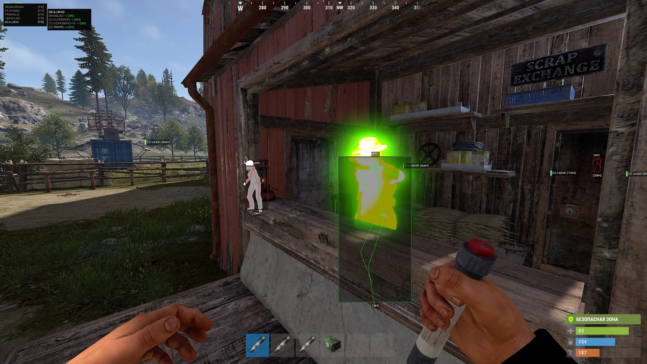 ESP for players and NPCs includes boxes, skeletons, nicknames, distances, plus the visibility of sleeping players and dead bodies. Such detailing allows you to assess situations in advance, control territories, and make tactical decisions without unnecessary risks.